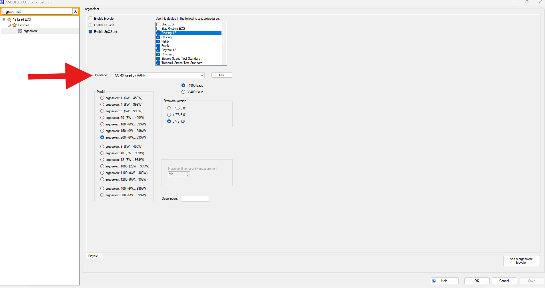 Then once you are in the settings in the search bar at the top you will need to search 'ergoselect' then under Bicycles you will need to click on the ergoselect tab and then you will be able to see which COM port the bike is using. (See below for reference your COM port may be different).