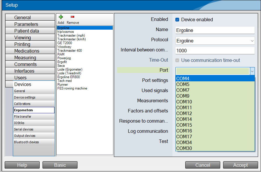 First step would be to go into setup at the top of Blue Cherry select advanced and then click onto the devices tab down the left hand side then select Ergometers and then in the middle find Ergoline click on that so it is highlighted blue. Then on the right side of the settings menu you will need to make sure the device enabled tab is ticked and then in the port drop down you will need to then click on the port number you found for the bike in Amedtec.