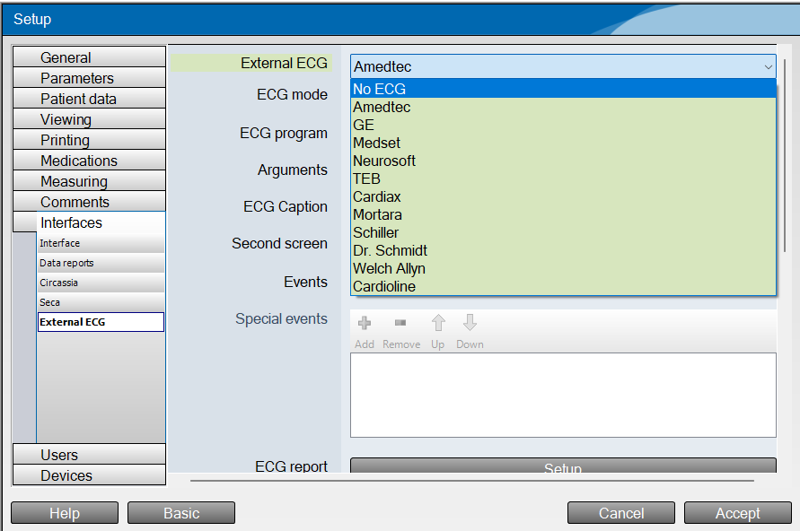 Once this is done stay in the settings menu and click on Interfaces then in the drop down select 'External ECG' When you are in the menu you should see that Amedtec is set as the External ECG at the top. You will need to click on the drop down box and then select No ECG.